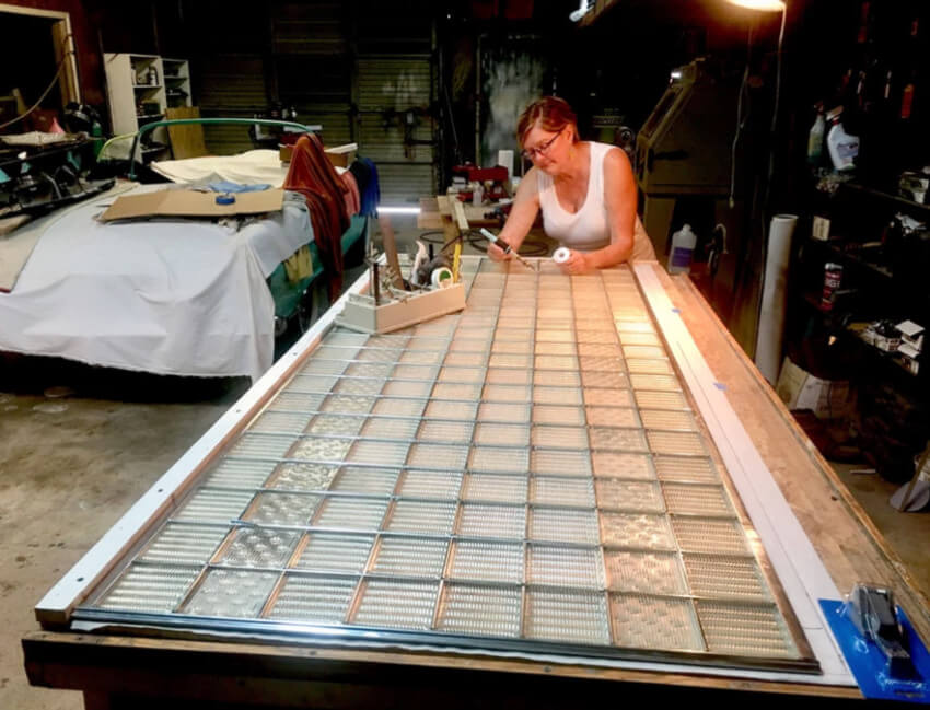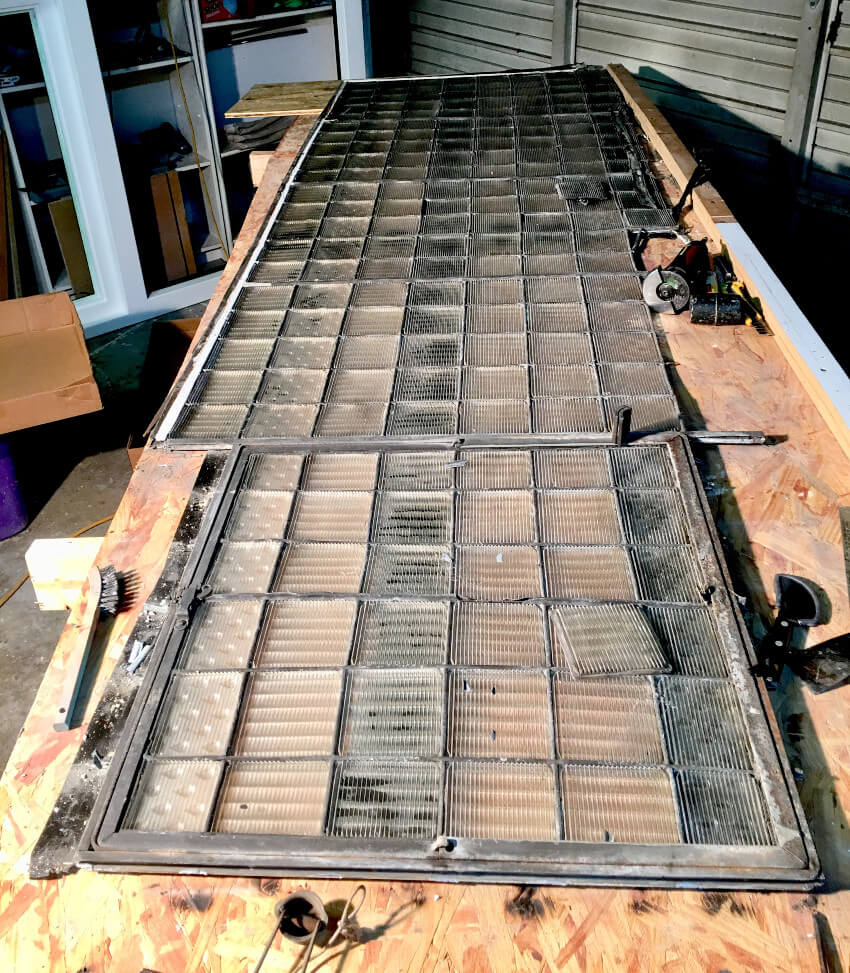 Luxfer glass transoms were typically installed in the upper registers of windows in both industrial and commercial spaces. These ribbed, 4-inch square sheets of glass used refraction to illuminate large, deep spaces with natural light.