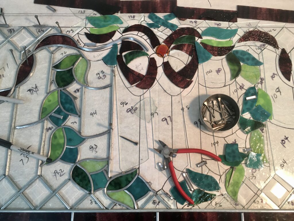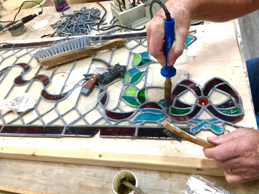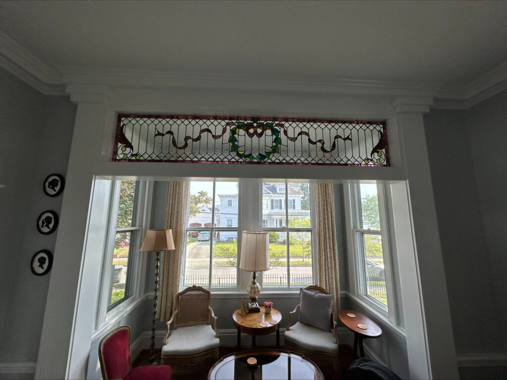 Wissmach still makes turquoise and wine tones similar to what was used in this transom. As with any hand-made glass, color can vary slightly from batch to batch. When restoration requires replacement, the goal is always a respectful match that keeps the piece cohesive and historically aligned.