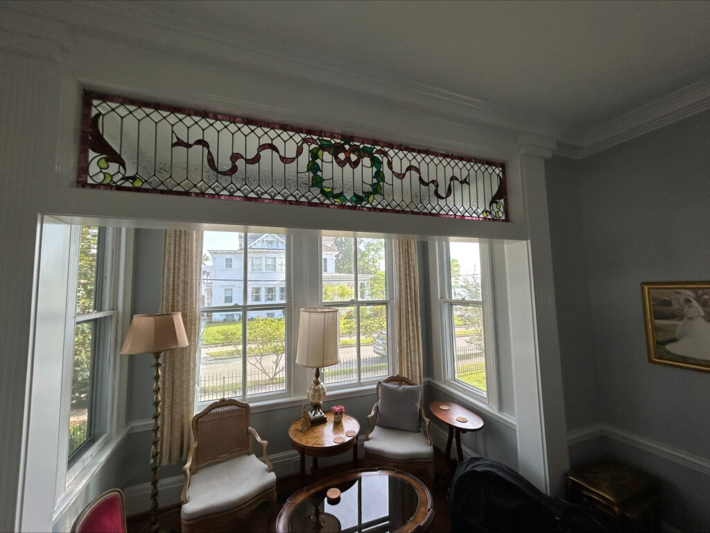 Another detail that makes this transom especially meaningful is its North Carolina connection. Glue chip glass for this Victorian transom was produced in Laurinburg, North Carolina, which is about 161 miles from New Bern. At the time, Pilkington Glass Factory in Laurinburg was the only factory producing glue chip glass.